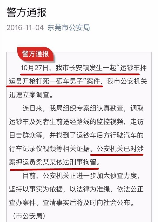 通报称10月27日,东莞市长安镇发生一起“运钞车押运员开枪打死一砸车男子”案件,东莞市公安机关迅速立案调查。