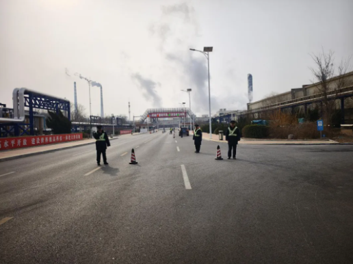 演练中,模拟一辆拉运钢材的货车在厂院内部道路侧翻、驾驶员安全撤离,钢材散落导致厂内道路交通拥堵的场景。保安队迅速启动预案、依令行动。现场组,队员向支队长报告情况、控制现场、组织救援;交通疏导组,疏导车辆和围观群众。两个小组配合默契,严格执行应急预案操作流程,顺利完成演练任务。