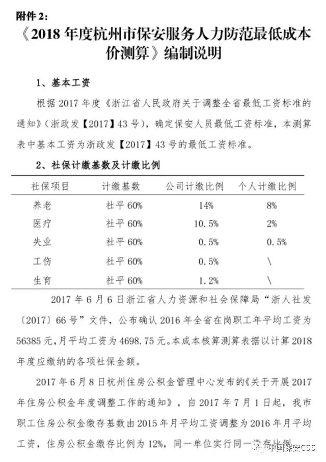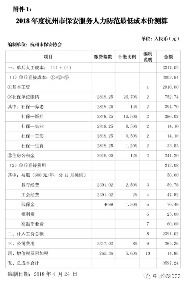 附件1:《2018年度杭州市保安服务人力防范最低成本价测算》