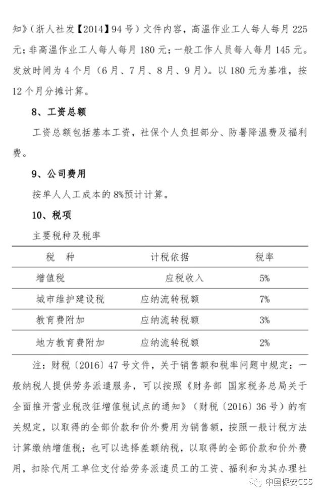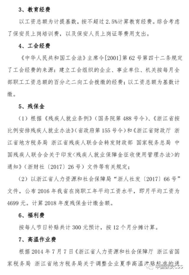 为规范市场、稳定行业、服务企业、发展产业,根据国家有关政策法规和省、市有关部门发布的政策法规的规定,市协会在深入调查研究,并经广泛征求各会员单位意见后,根据保安服务业发展状况,经会长办公会议审议,协会拟定了《2018年度杭州市保安服务人力防范最低成本价测算》(见附件1),现印发给你们。执行中有何问题,请及时与市保安协会联系。